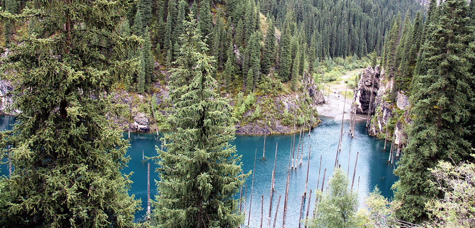 Lake Kaindy was formed quite recently, namely in 1911, during a devastating earthquake. Lake Kaindy is small, about 400 m long, about 21 m deep. The lake is located at an altitude of 1,670 m above sea level, surrounded by coniferous spruce trees.
