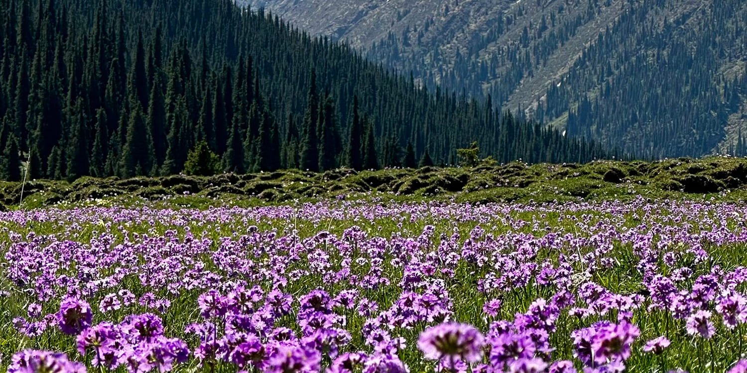 Мы увидим ковры цветущих альпийских лугов среди гор, где нежные травы и разноцветные растения покрывают склоны, наполняя воздух свежим ароматом и создавая ощущение живой, сказочной природы.